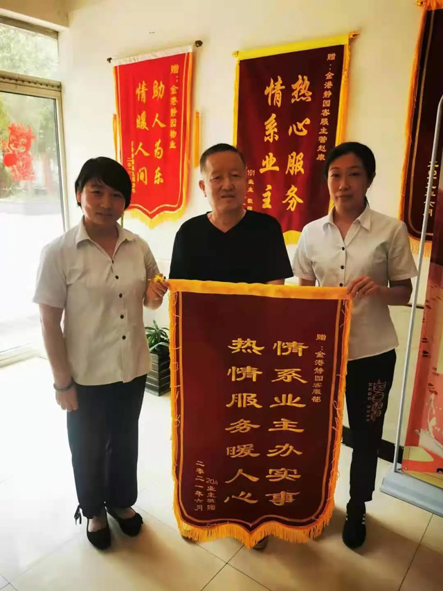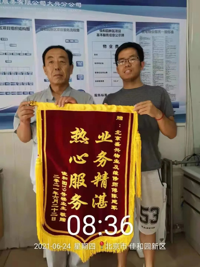 19- 1802業(yè)主家中裝修完了在放味,夫妻都上班沒時間過來,丁師傅每天幫忙開窗戶,關窗戶,家里換零件,搬東西丁師傅都隨叫隨到,這種積極負責,把業(yè)主當“自家人”的服務態(tài)度,得到了業(yè)主的認可,特送來錦旗,表示感謝。